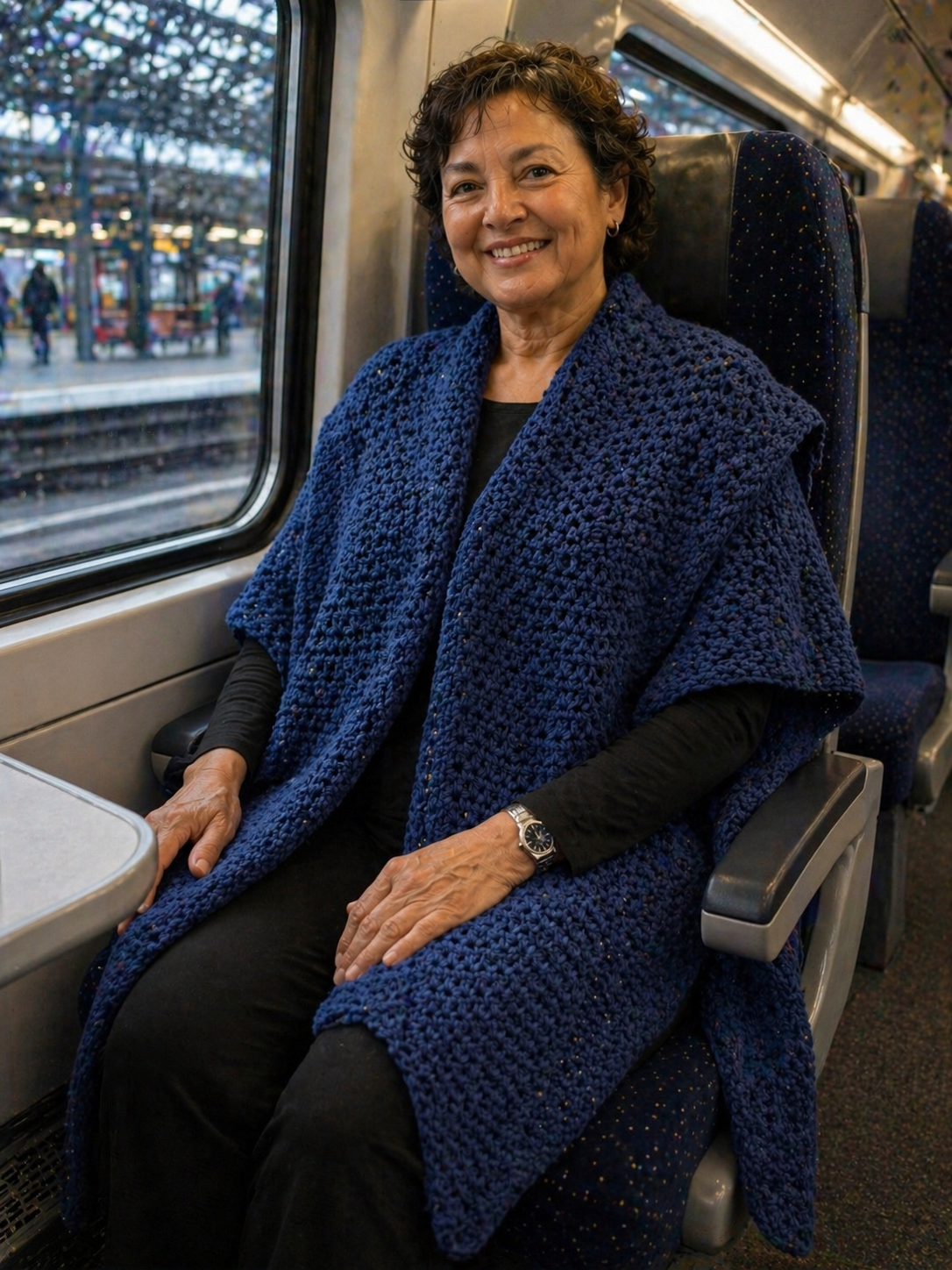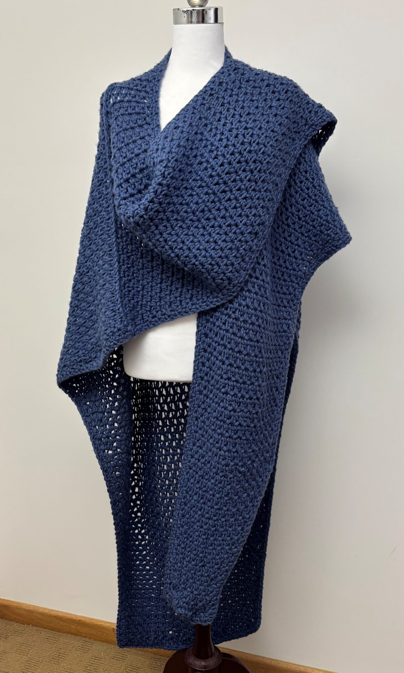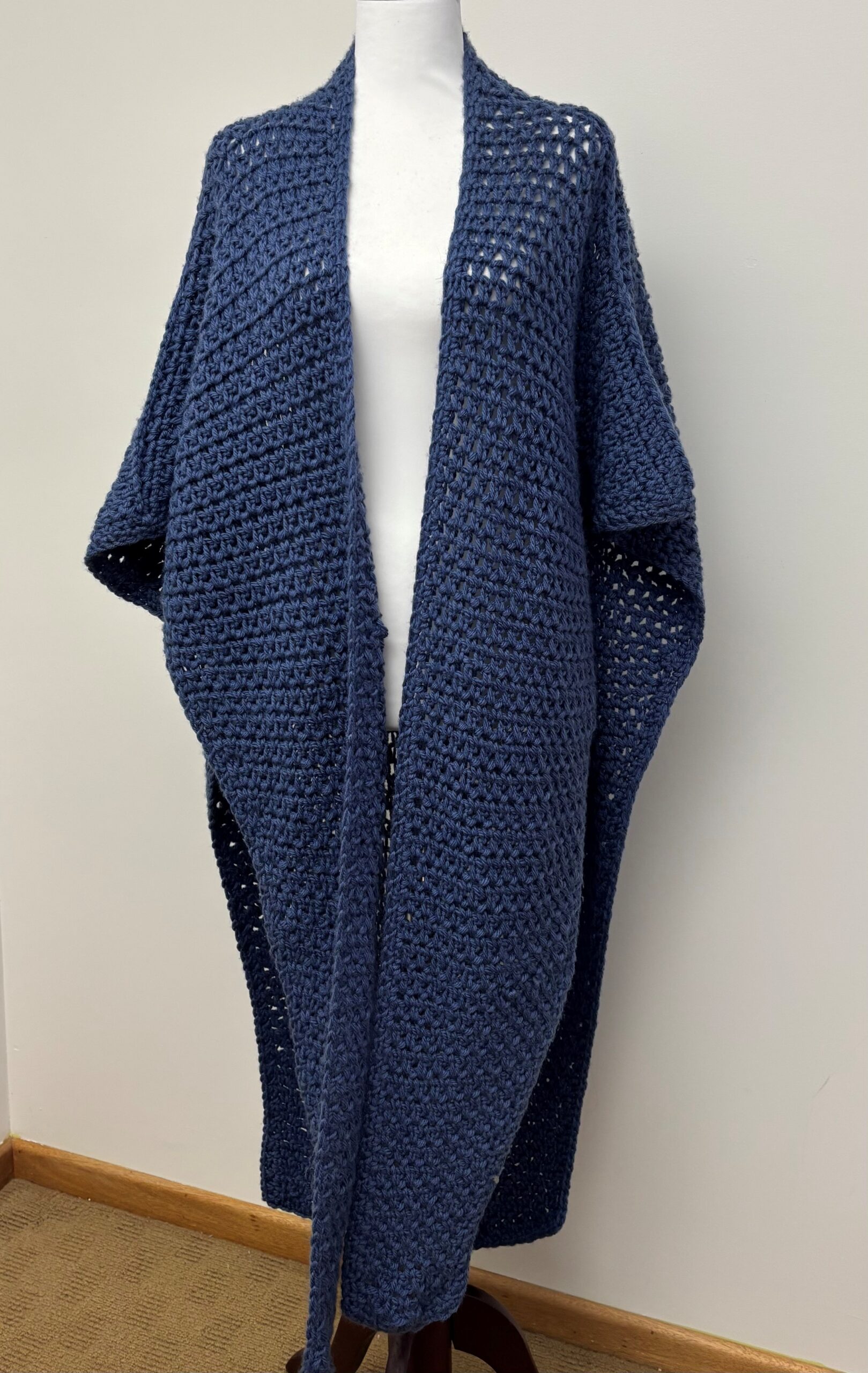 This toasty warm wrap is the ultimate travelling companion. Worked in simple double crochet and chains, it grows quickly on an 11.5 mm hook. It is perfect for those moments when you want to make without thinking. Versatile and effortless, it can be worn belted or loose, wrapped a dozen different ways, and tucked into your bag for whenever the weather turns cool. Flip it back‑to‑front as a cosy blanket while travelling, and it becomes comfort on demand.